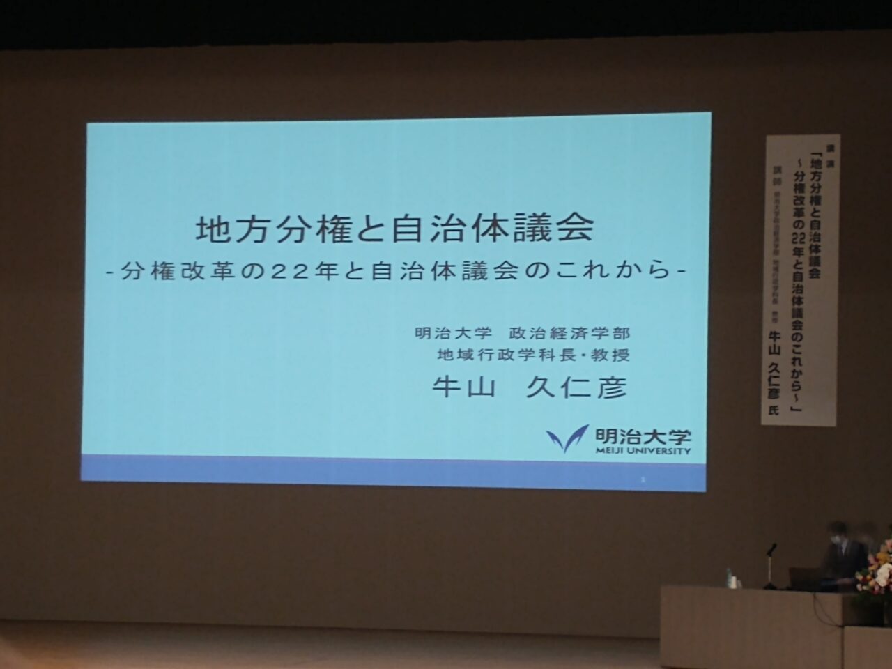 東大和市議会からも多くの議員が参加。明治大学の牛山久仁彦教授による「地方分権と自治体議会~分権改革の22年と自治体議会のこれから~」と題した講演が行われました。