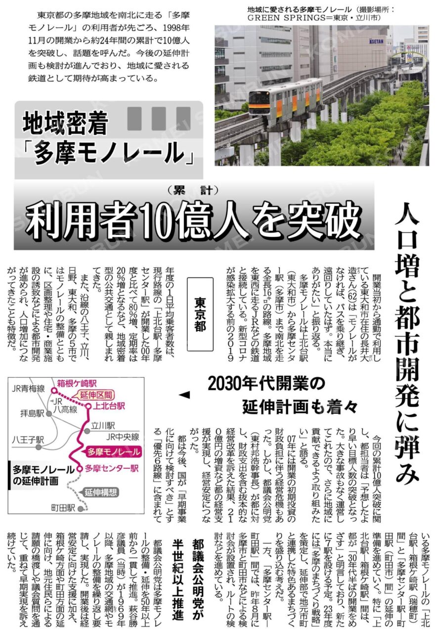 多摩モノレール利用者10億人突破! 2023年5月1日 最終更新日時 : 2023年5月1日 satake 本日5月1日付の公明新聞に、多摩モノレールの利用者10億人突破と延伸計画の記事が掲載をされました。地元東大和市の利用者の方のお声も載っています。公明党が先頭に立って推進した事業の大きな成果であり、今後のさらなる進展へさらに力を入れていきたいと思います。 XBluesky