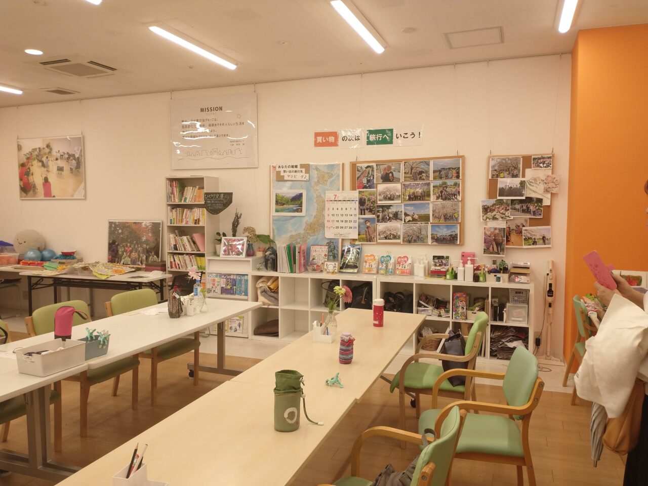 店内2階にサロンスペースがあり、ここで健康体操や認知症予防のためのレクリエーション等を行います。その後、地下1階の広いフロアを歩きながら、自分で買い物を行います。帰りは品物と一緒に車で送ってもらうことが出来ます。