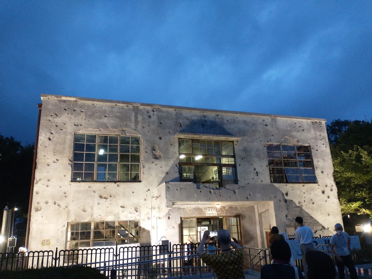 そして、周囲が暮れてきたところで平和祈念キャンドルの点灯が行われ、戦争遺跡「旧日立航空機株式会社変電所跡」がライトアップ。