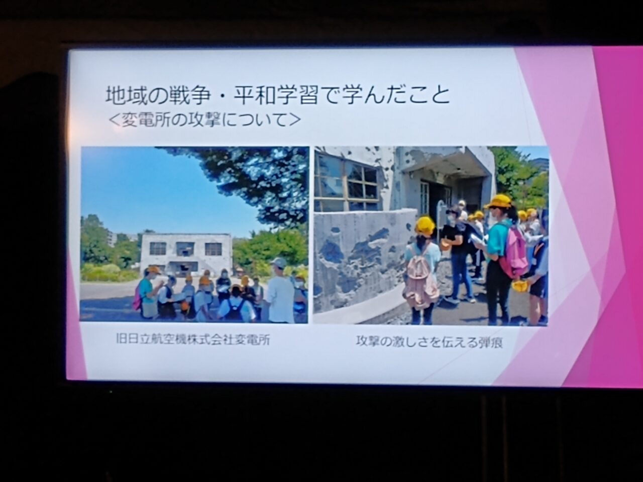 続く平和祈念式典では、和地市長・東口議長・渡部東村山市長からの挨拶、小池都知事のメッセージ紹介がなされた後、東大和市と東村山市の小・中学生による広島派遣事業報告会が行われました。登壇した両市の小・中学生からは、地元での戦争被害や広島での原爆の惨状の学習を通して、平和への強い思いが心の中に形成されていく様子が、実感を持って伝わってきました。こうした経験が、子どもたちの心に平和の種を植えることになっています。その平和の種を大事に育て、両市の子どもたちが将来、世界平和に貢献する人材へと育っていかれることを祈ってやみません。