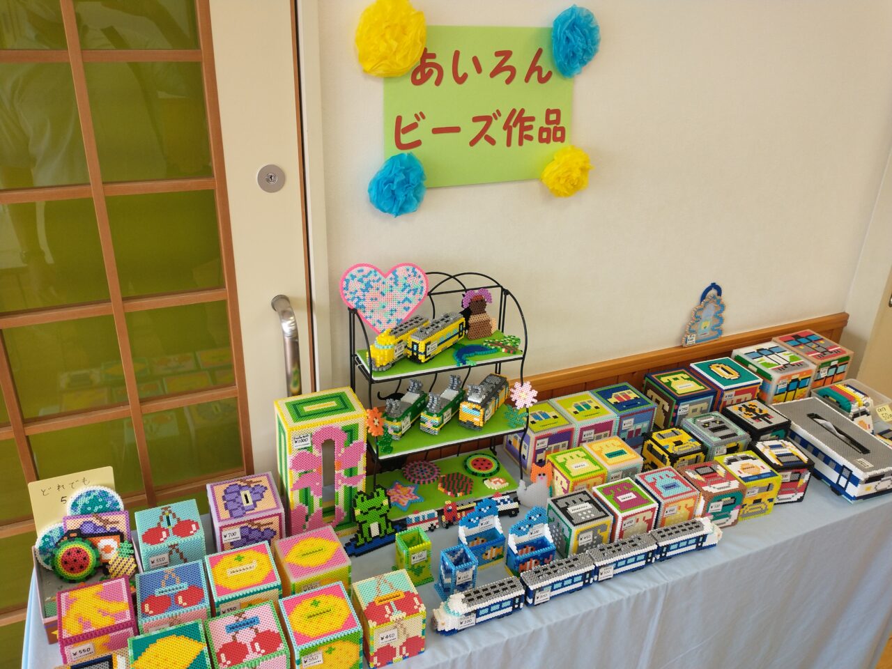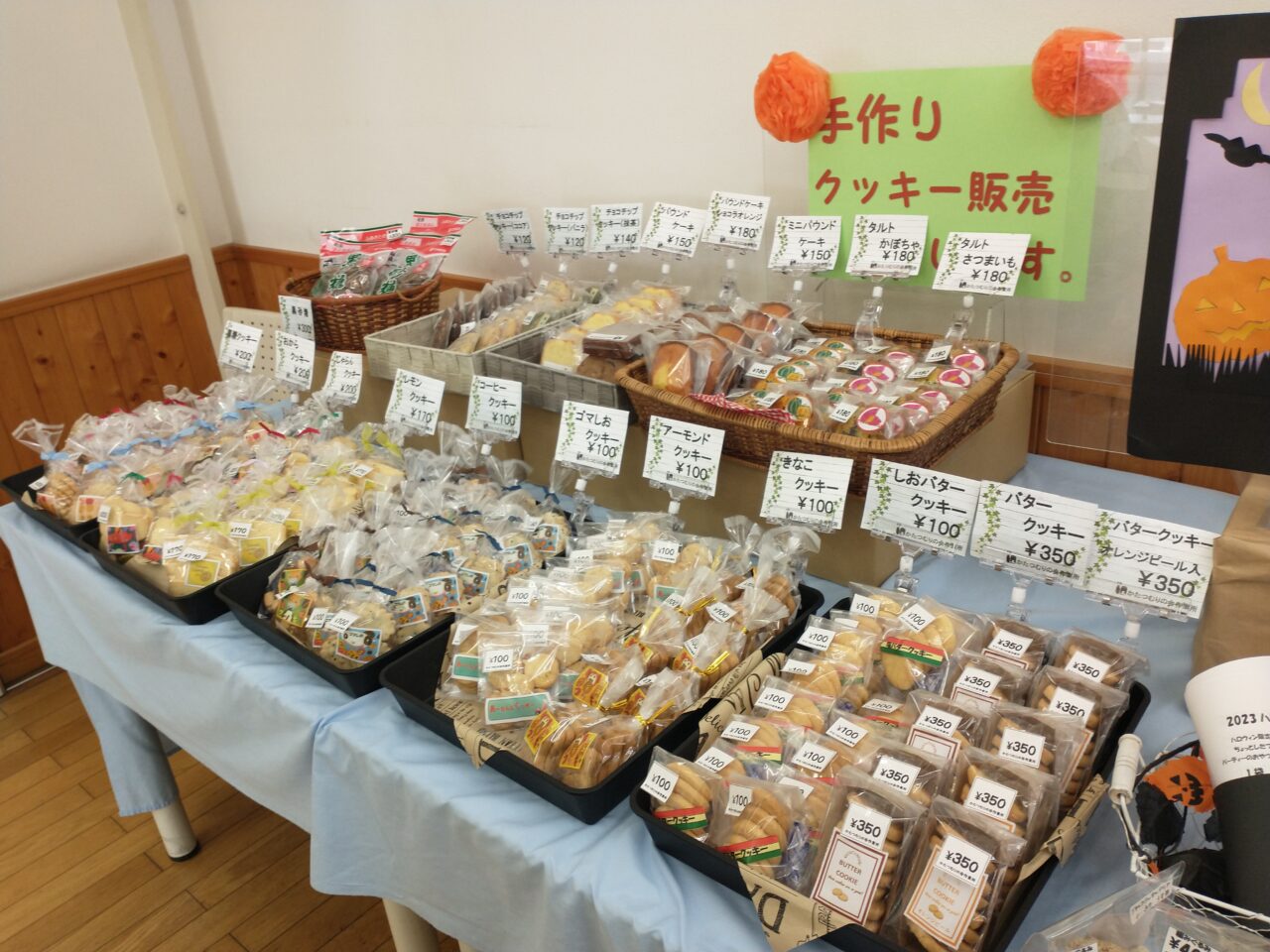 開始と同時に、近隣の方などお越しになっておられ、心待ちにしてこられた様子。室内では、バザーの品や作業所で作られたクッキーや雑貨が売られ、また外の屋台では焼きそばやフランクフルト、カレー、チョコバナナなどが販売されていました。また、丁寧に彩色された絵画作品も拝見させていただきました。