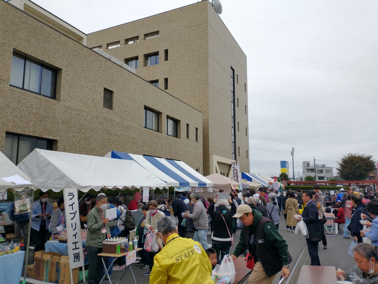 市役所中庭・駐車場スペースを活用した模擬店では、各関係団体が普段制作している商品の販売や、この福祉祭に合わせて温かな飲食の提供をしていました。曇り空で肌寒い陽気でしたが、大勢の方が集われ久し振りの福祉祭を楽しんでいらっしゃいました。