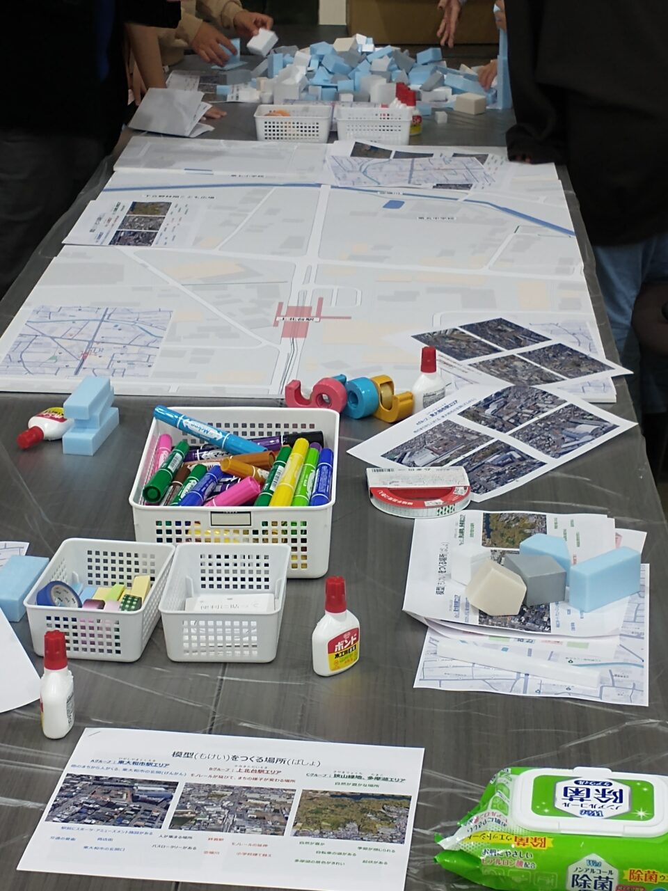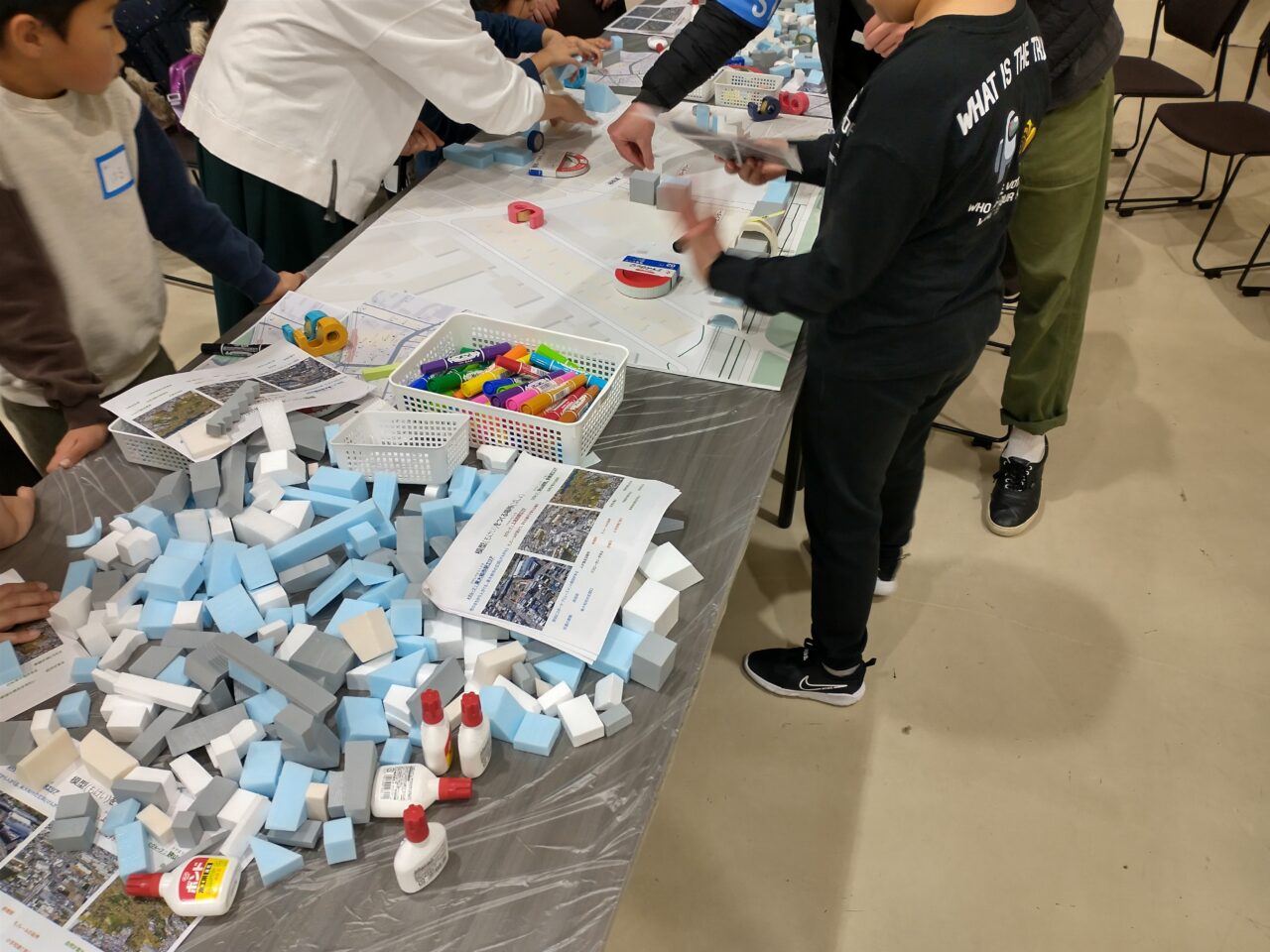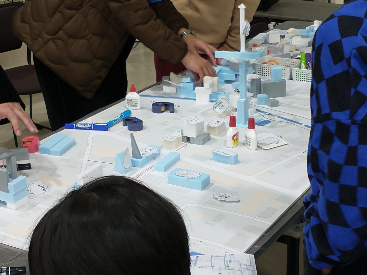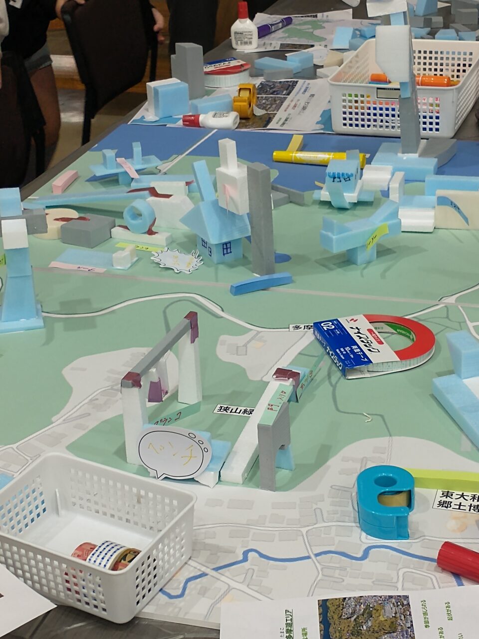 今日のイベントでは、こどもたちが3グループに分かれ、それぞれ「多摩湖・狭山丘陵」「上北台駅周辺」「東大和市駅周辺」の新たなまちづくりを考えるものです。大きな地図が広げられ、自分たちが考えた「みらいのまち」を模型を使って形作っていくものです。