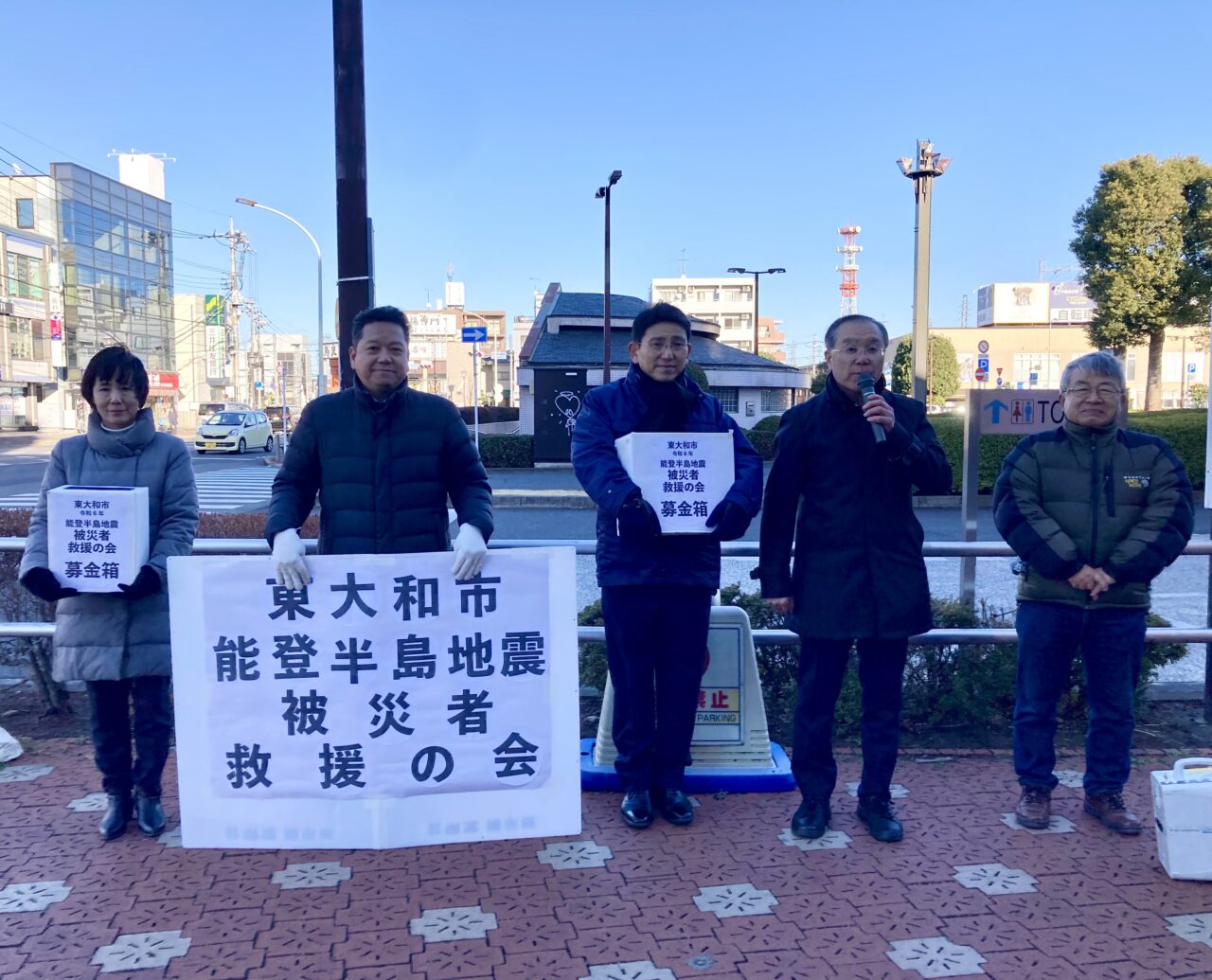 東大和市駅ロータリーにおいて、「東大和市能登半島地震被災者救援の会」主催の街頭募金活動に、市議会公明党として協力させていただきました。