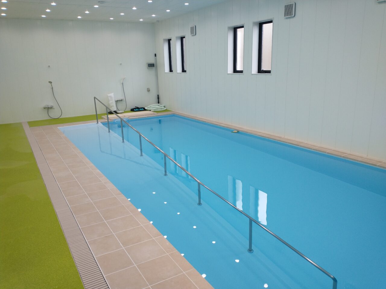 車椅子の方の作業を行うので、広いスペースが確保され、重力の負荷を軽減して体の可動域を広くして動かせるように温水プールも設置されていました。日中の作業や交流が快適に行えるよう、職員の方も心配りをされて建設を進められたようです。