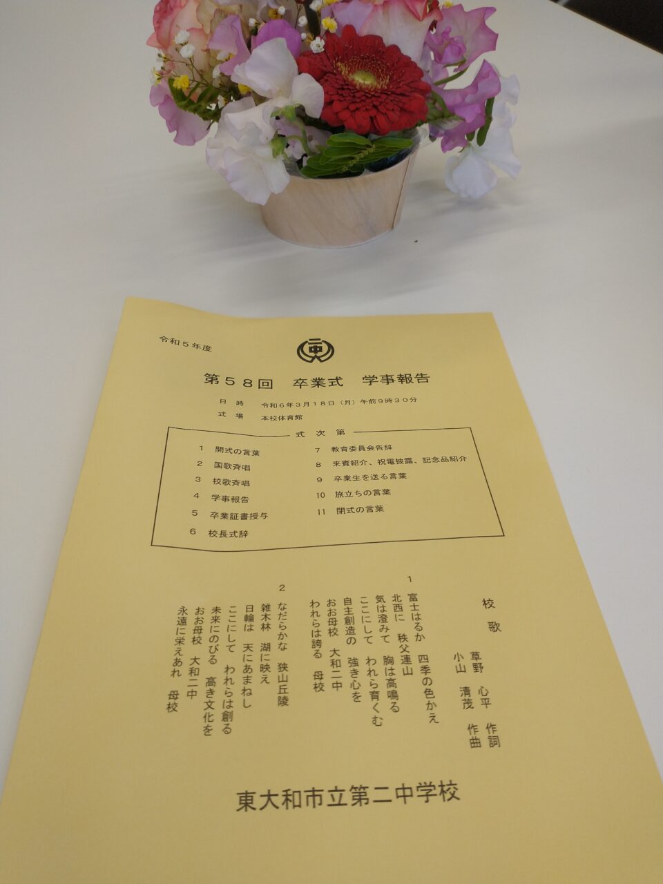 卒業生は、小学校の時に日光への移動教室が無かった世代です。コロナ禍の影響を大きく受けた学年ですが、卒業生の旅立ちの言葉では、その中で友情を育み、学業や部活動、各行事に挑戦した3年間の軌跡が語られました。改めて環境に負けなかった姿を知ることが出来、卒業生の姿が一層たくましく感じられました。