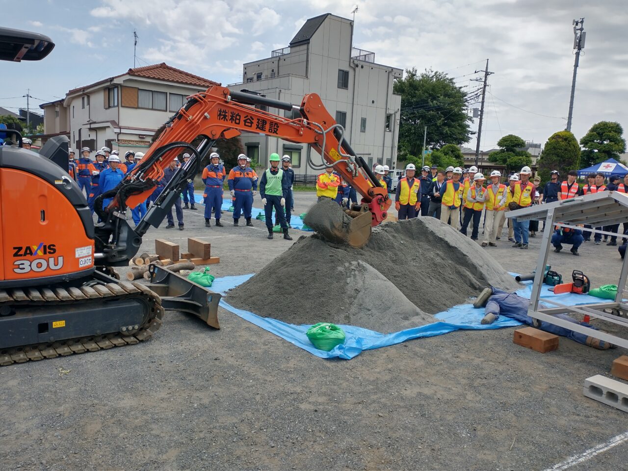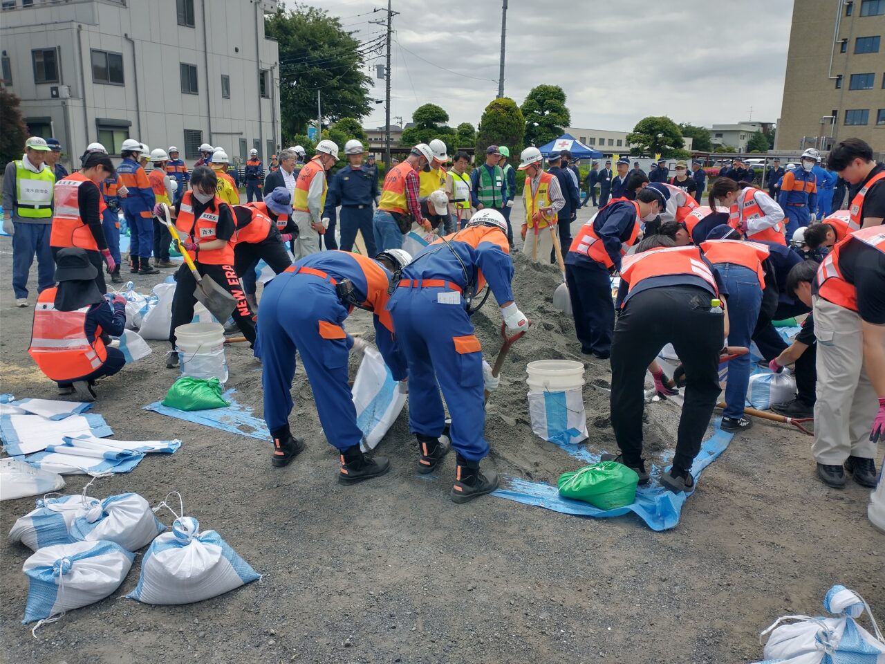 東大和市消防団の皆さんをはじめ、北多摩西部消防署、新入を中心とした市職員の方、清水の自治会の方など多くの方の参加を得て、土砂災害倒壊家屋救出訓練、土のう作成訓練、積み土のう工法、改良積み土のう工法、マンホール噴出防止工法などの訓練が行われました。
