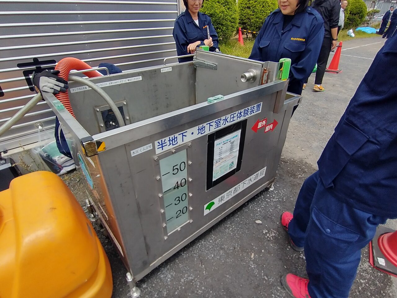 また、自宅ドアの外に道路冠水の水位が上がって開閉ができない状況を体験できる機器や、ドローン操作によって情報を把握するデモなども行われました。