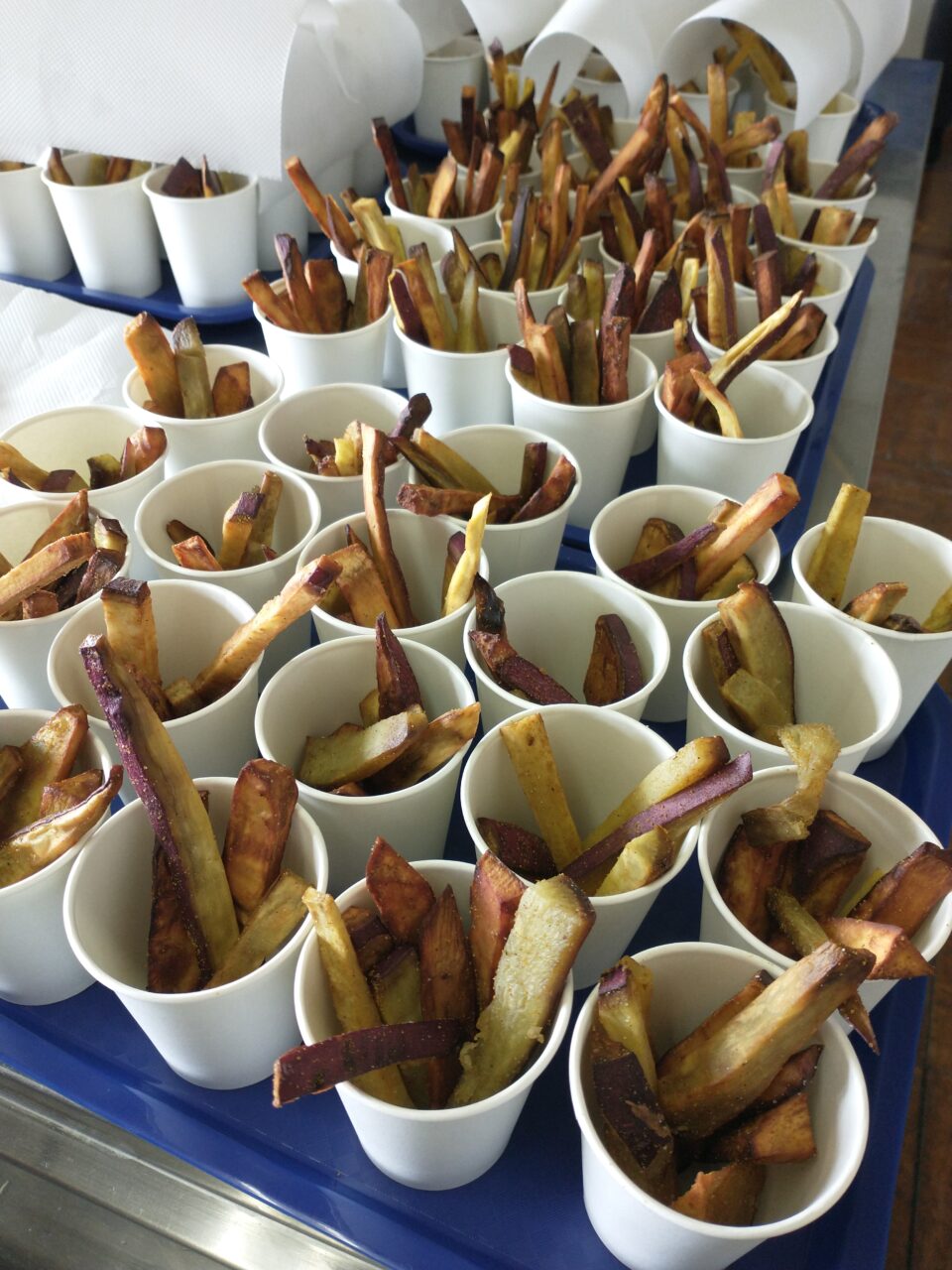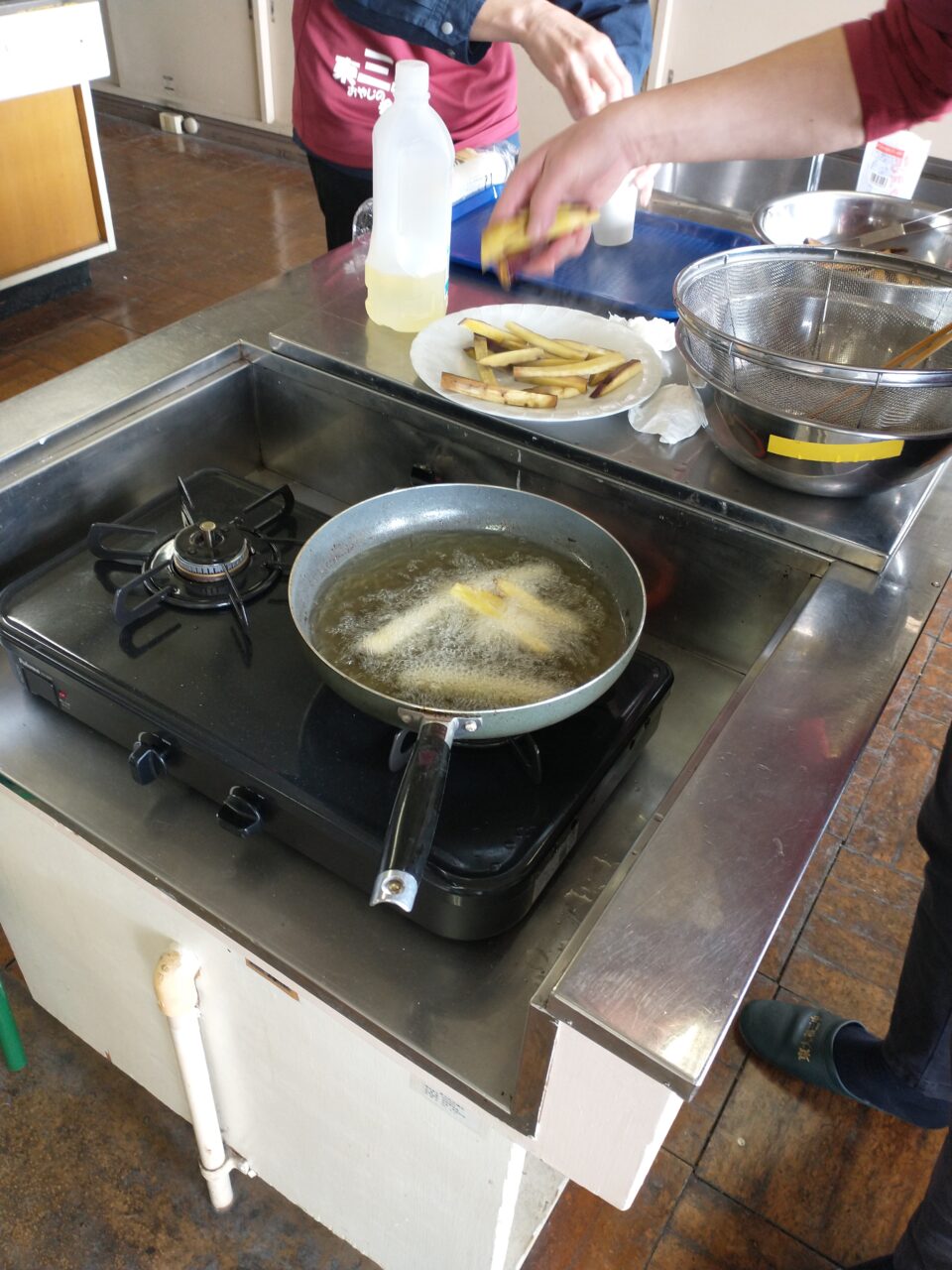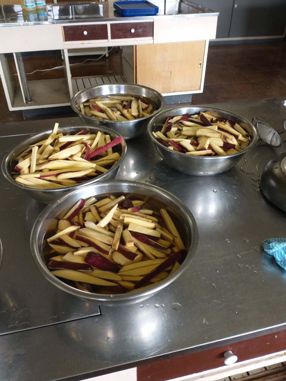 東大和第三中学校の東三会(とうさんかい:三中おやじの会)が、学校敷地内の畑で作ったサツマイモを素揚げにして、今日、部活に来ていた生徒へ振舞いました。私は正式メンバーではありませんが、東三会サポーターとしてお手伝いをさせていただきました。みんな美味しく食べてくれたようで、笑顔を見ているとこちらも嬉しくなりました。