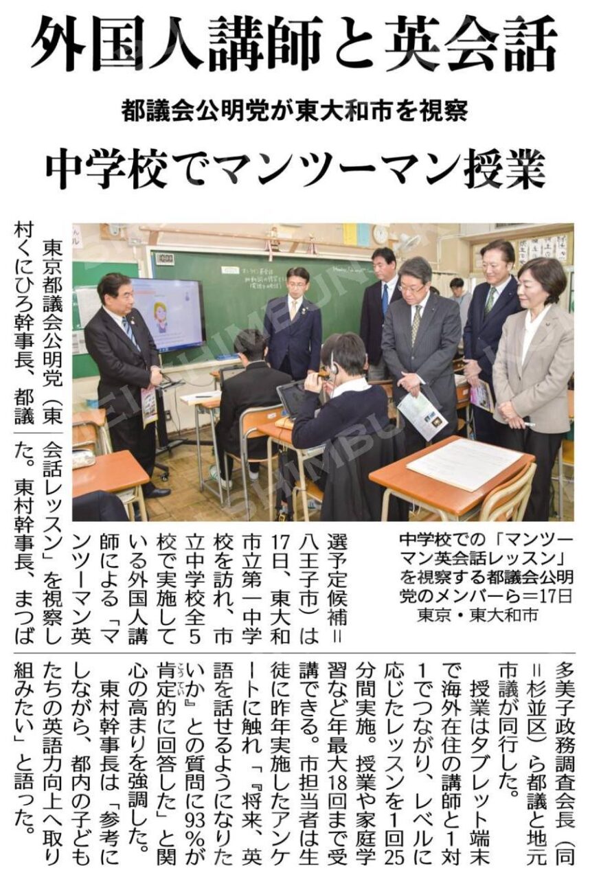 昨日、都議会公明党の4名の議員が来訪され、第一中学校で、マンツーマン英会話レッスンの授業を視察し、その模様が本日の公明新聞に掲載されました。