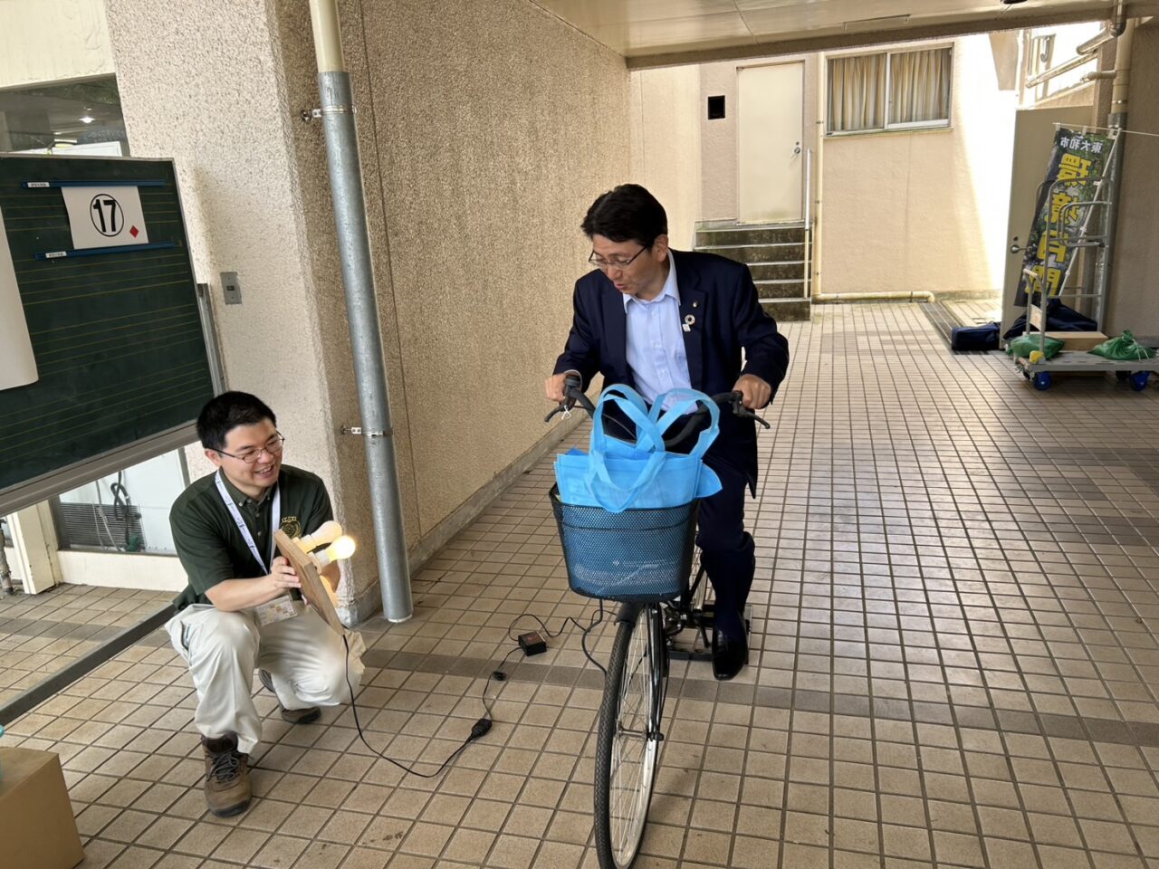会場では体験コーナーもあり、自転車をこいでの発電に挑戦。LEDを光らせるには普通にこげばいいのですが、白熱電球はより強く長くこがなければ安定して光らずに、思った以上にこぎました。LEDの省エネを身をもって実感しました。