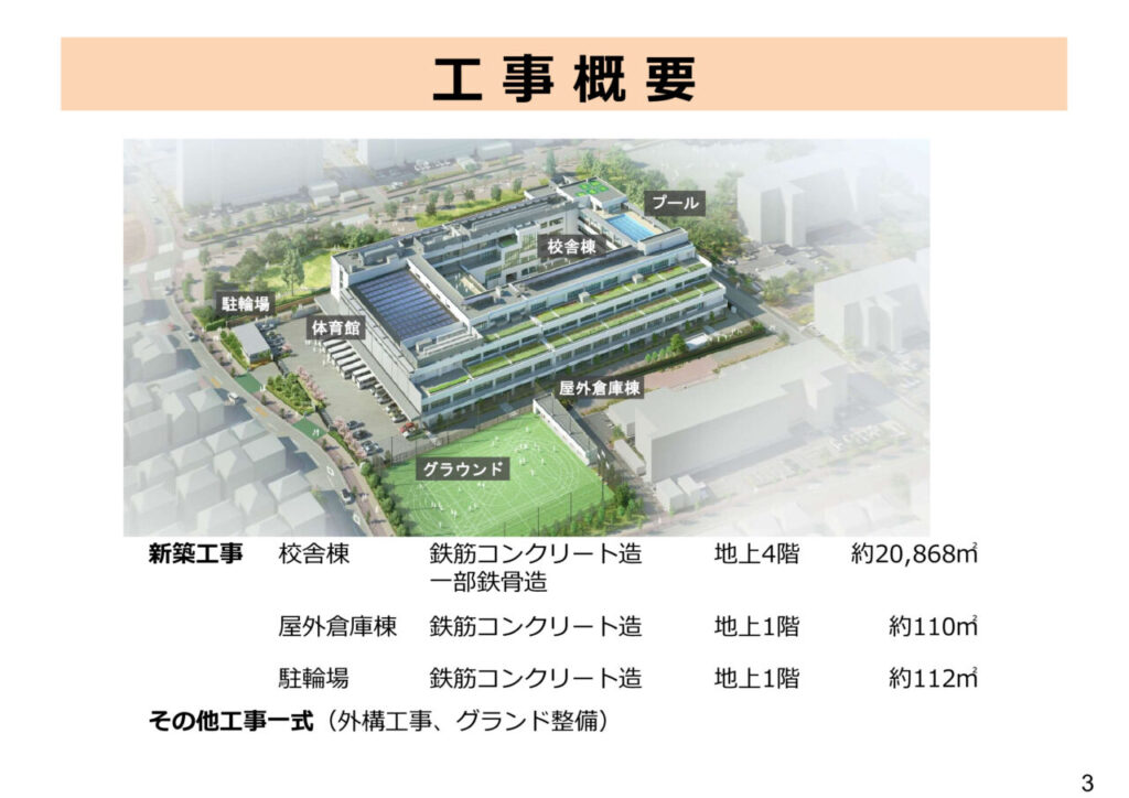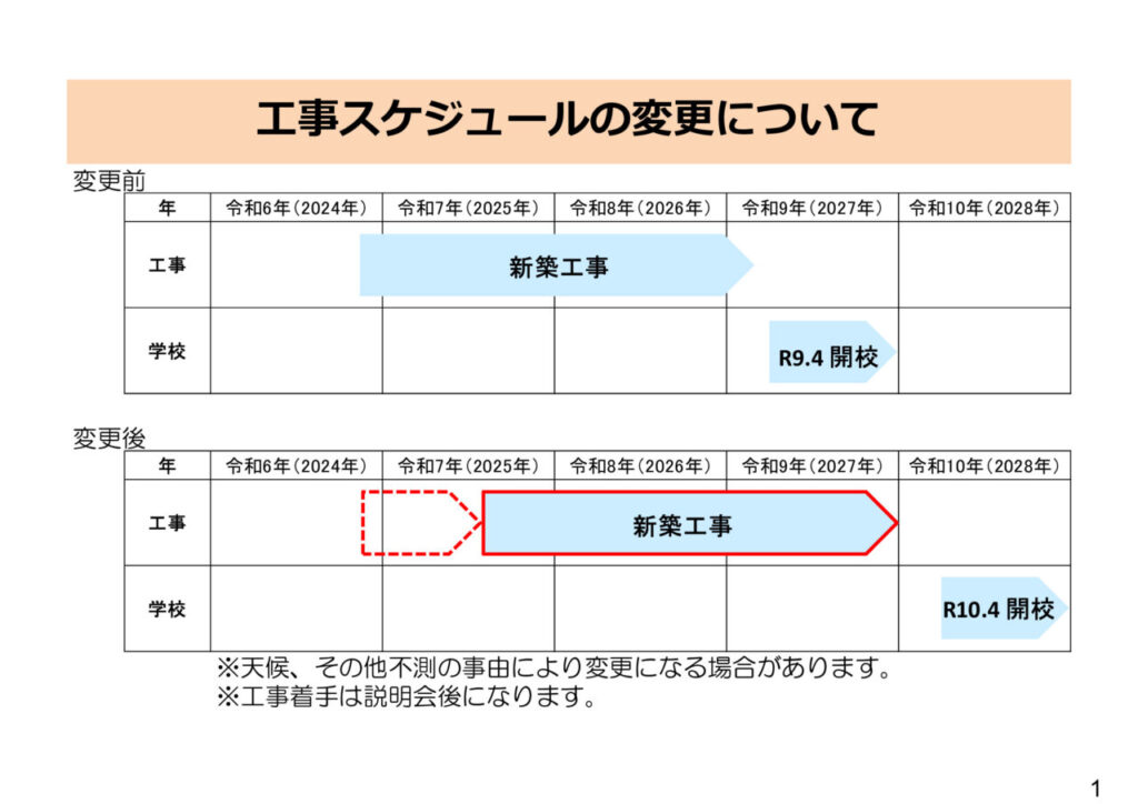 当初、令和9年度に開校予定でしたが、埋設物の撤去や入札の関係で工期予定が1年ずれ込み、令和10年度開校予定となりました。