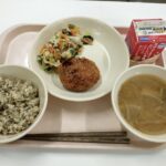 メニューは、東大和野菜の塩麴炒め・手作りビーツコロッケ・狭山茶っ葉ごはん・秋野菜の打ち豆汁・牛乳です。