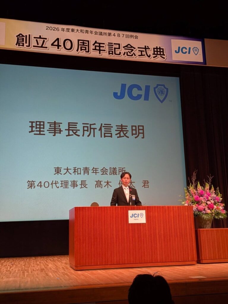東大和青年会議所40周年記念式典 2026年1月21日 最終更新日時 : 2026年1月21日 satake 昨日は、ハミングホールで東大和青年会議所の結成40周年記念の式典が、賀詞交歓会も兼ねて行われました。 新理事長の髙木理事長の決意表明をはじめ、例年にも増して素晴らしい、清々しい式典でした。歴代40名の理事長も登壇され、市内各分野のリーダーとして活躍されている方々ばかりで、JCが市の人材の揺籃となっていることを感じました。新理事長とは、親しくお話をさせていただいたこともあり、立派な青年リーダーとお見受けしております。 東大和青年会議所の皆様の益々のご活躍を期待しております。 #東大和青年会議所 #JC #東大和市 XBluesky